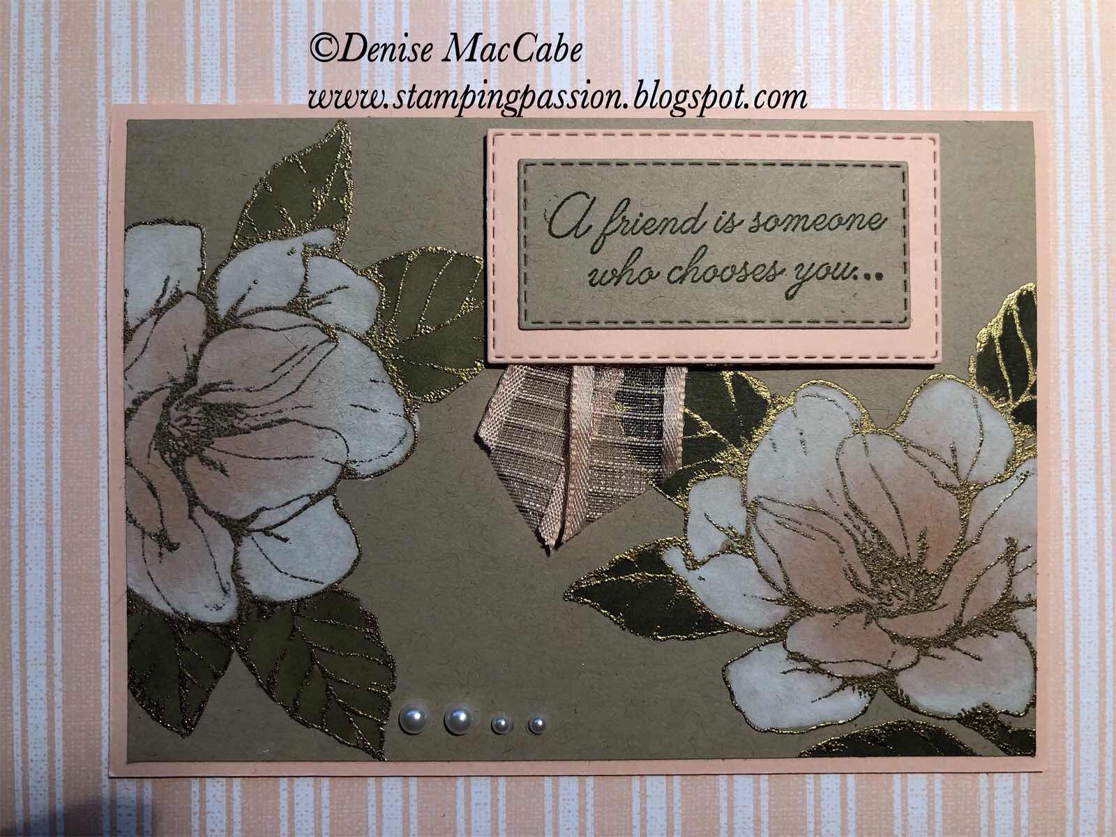 Good Morning Magnolia stamp set is a beautiful set and suite in the new catalogue. I gold embossed the flower image and then used the whitewashing technique to colour the magnolias and a dauber with Petal Pink ink to colour the centre of the flowers. The leaves were coloured using Mossy Meadow Stampin' Blends. Add a greeting, organza ribbon, some pearls and the card is complete.