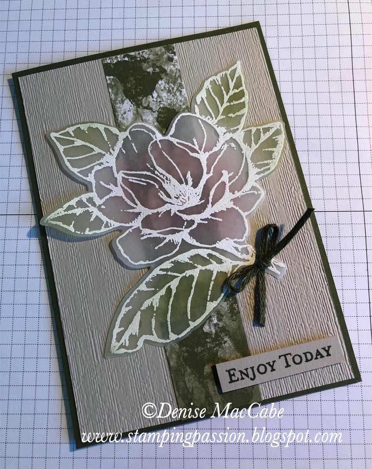 My “Make it Monday” today is using the retiring “Good Morning Magnolia” stamp set and dies. This is a lovely bundle. I have used it a lot but haven’t played with it for a while so I pulled it off the shelf and made this card. (Inspiration from Pinterest for the card layout and design).