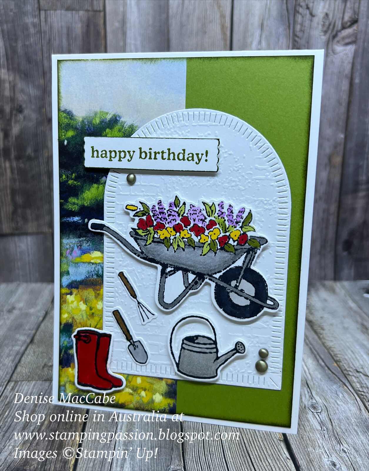 I stamped, coloured (with Stampin Blends) and die cut various images from the stamp set. I die cut the arch out and dry embossed the arch piece with the Exposed Brick 3D embossing folder. I attached a strip of the designer series paper on the left of the Old Olive card stock, attached the window arch piece, then the focal gardening pieces to the arch and card front. Attached the matting piece to the card base. A banner with the birthday sentiment and Brushed Metallic dots to finish off the creation.