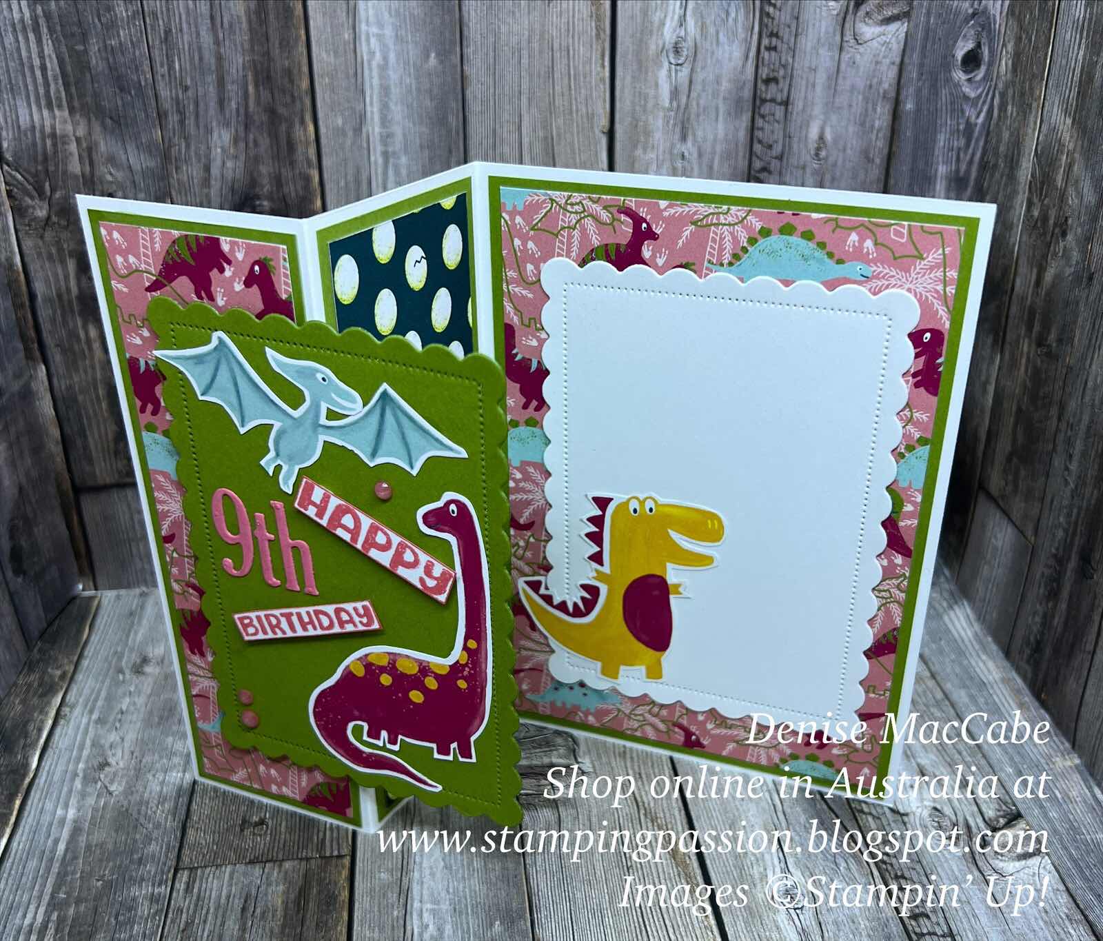 I created the simple “Z” fold card and used the Scalloped Contour dies to add interest. Fussy cutting some of the dinosaurs to feature on the card front and tucked inside. A birthday sentiment and number and some retired gems finish off the card.