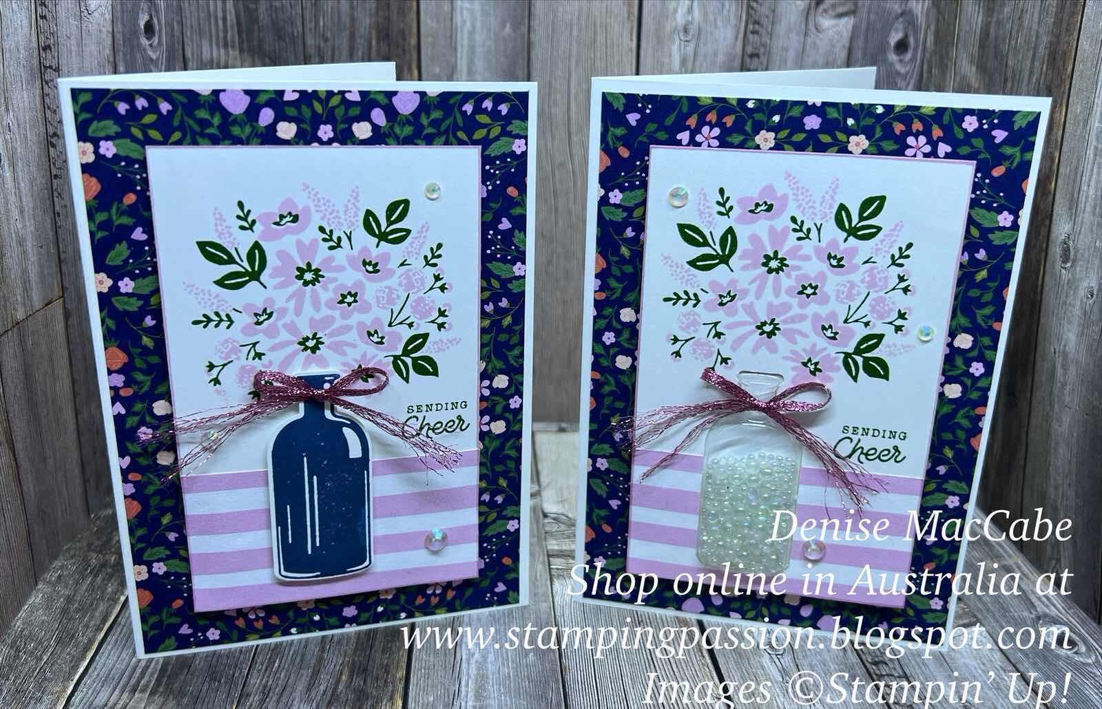 Bottled Happiness stamp set, Bottle punch, Bottle shaker domes, Delightfully Eclectic DSP, Iridescent Rhinestones and Sweet Sorbet Metallic ribbon.
