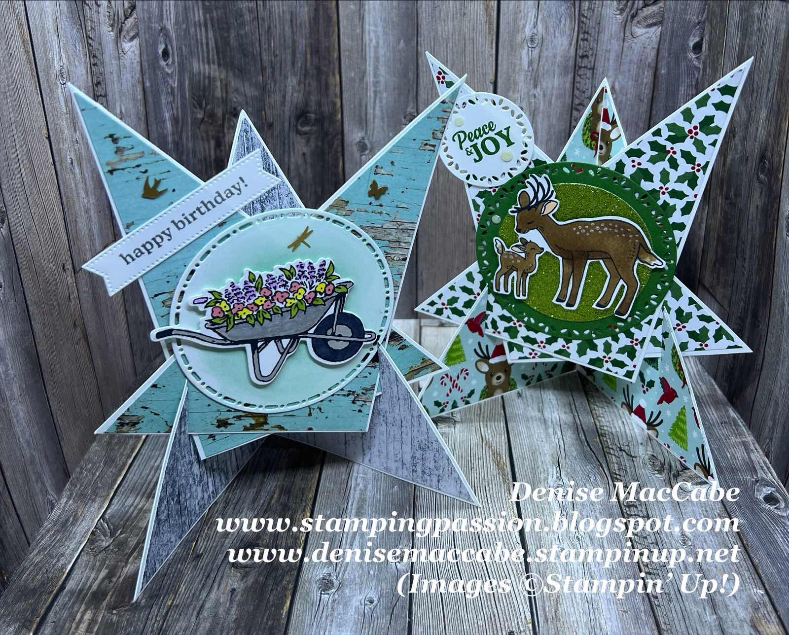 I used the Country Woods DSP, Garden Meadow bundle, Spotlight on Nature dies and Stylish Shapes dies to create our fun fold card on the left.