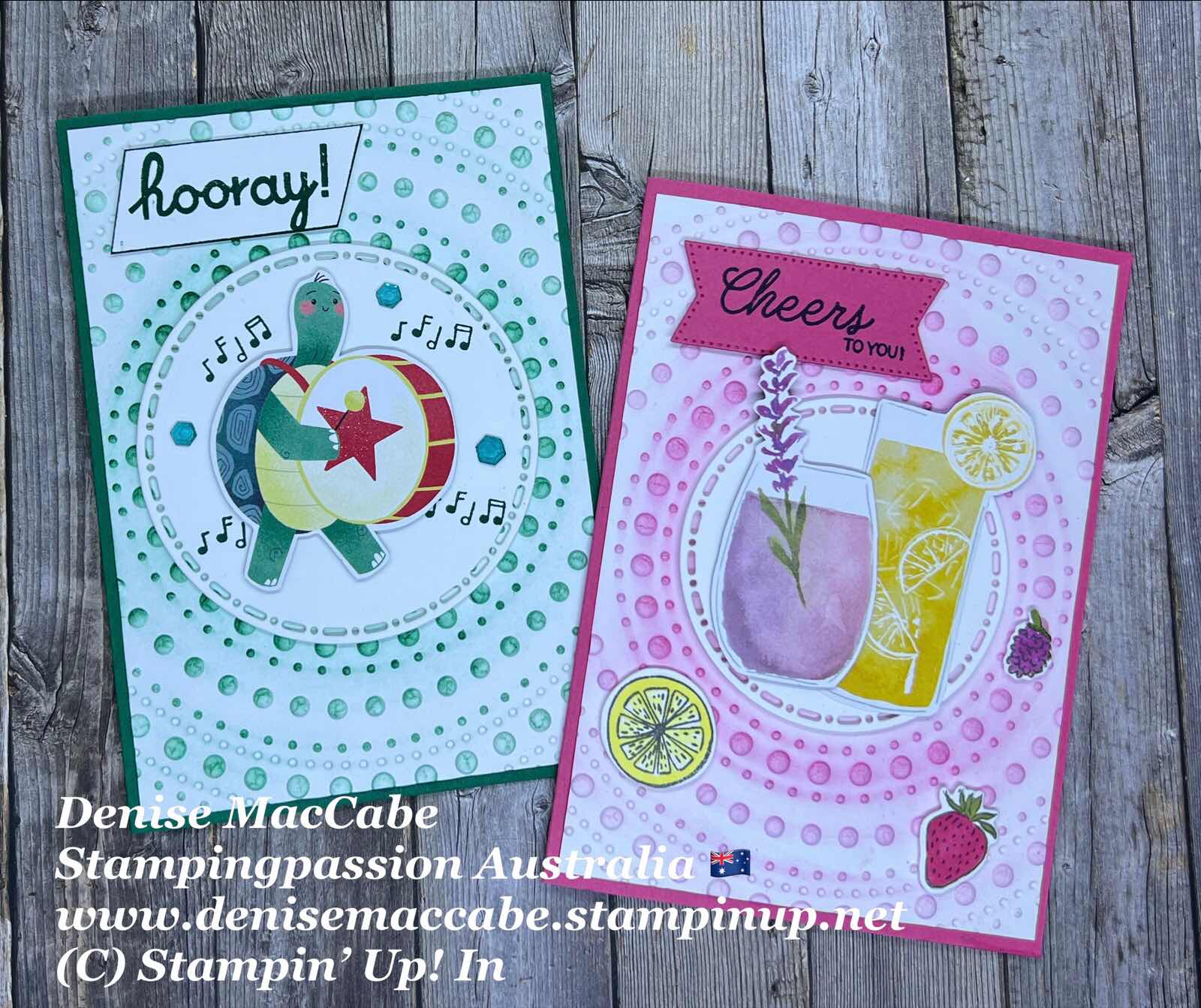 Using the Dotted Circles 3D embossing folder and Spotlight on Nature dies the Turtle DSP to create the fun turtle card. Celebratory Sips suite used on the card on the right. Easy layout to create some fun cards.