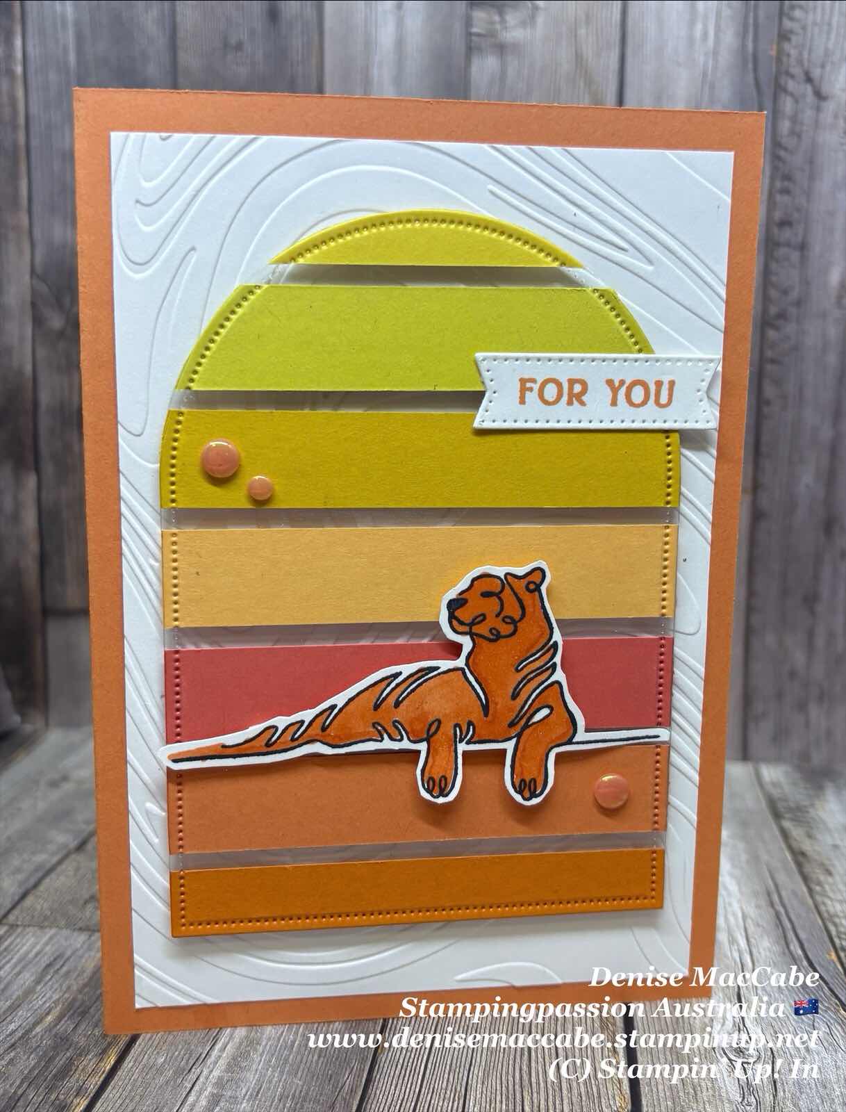 We coloured with the Timid Tiger stampin blends and embellished with the 25-27 In Colour Flat Pearls.